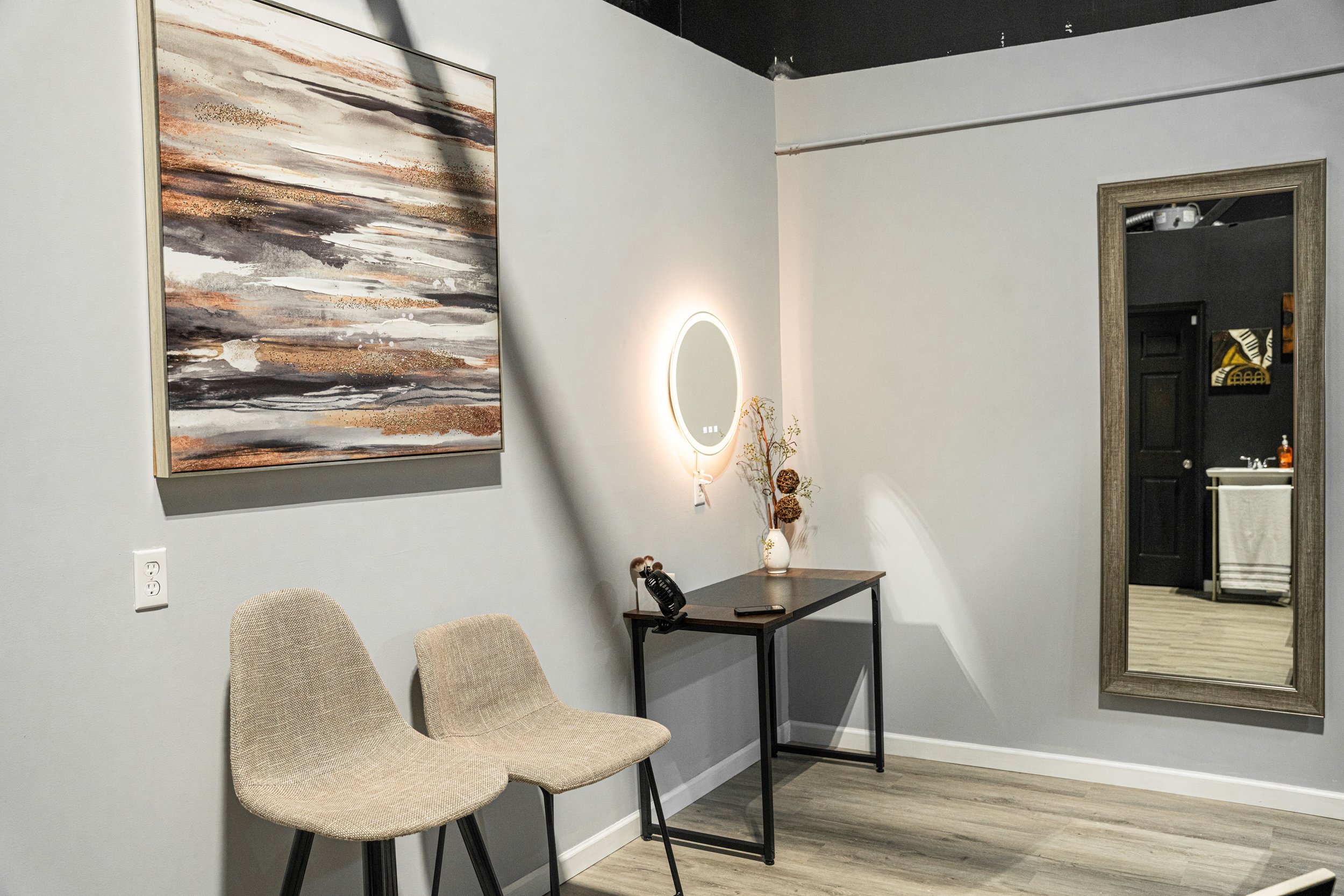 Our H&MU area has two stations, a wash sink and a two LED mirrors and a full body mirror.