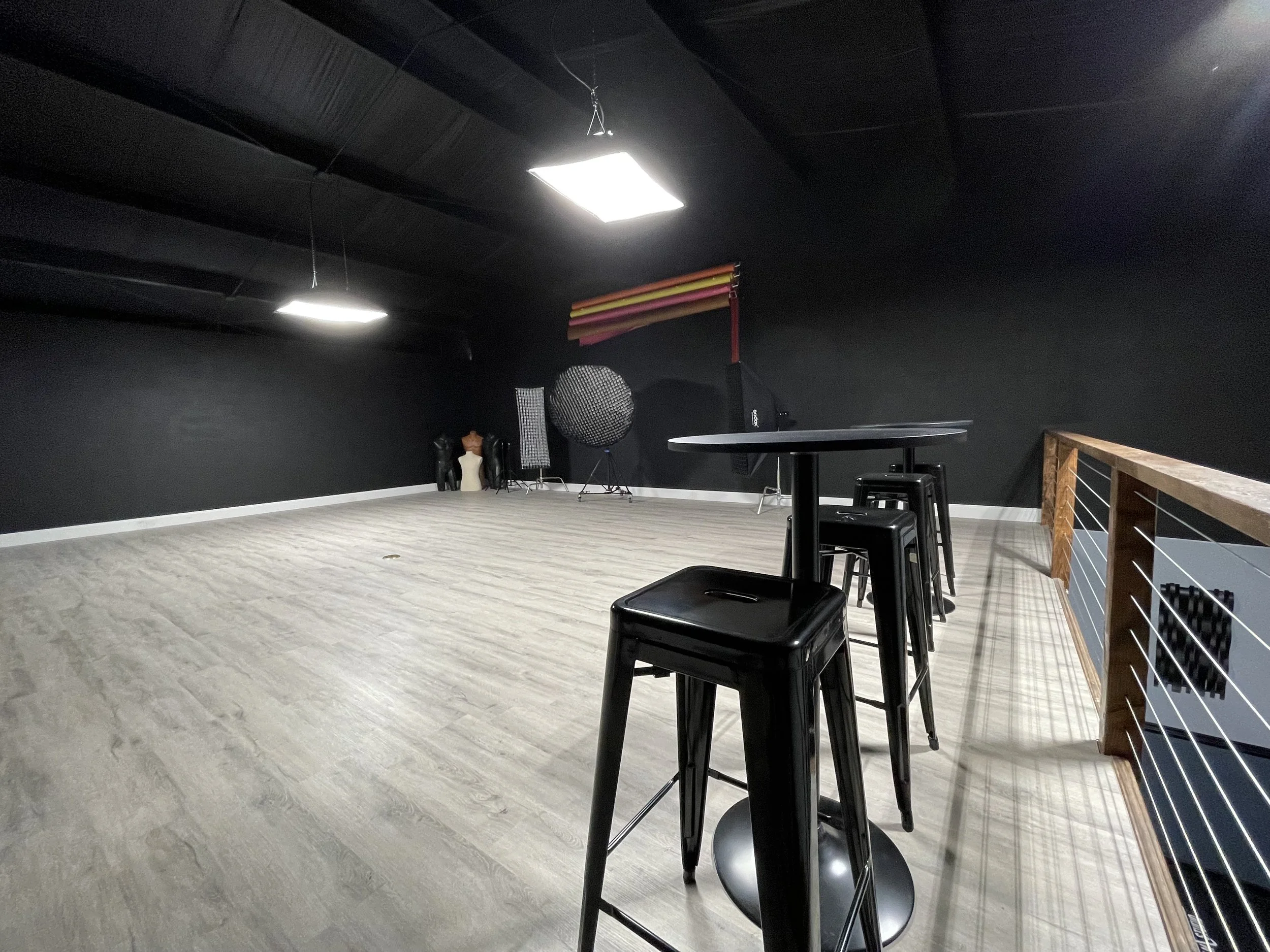 Our Photography Loft include 2 kicker lights, and a key light. We offer remote triggers for Sony, Canon, and Nikon. This space offers seating for eating and drinking as well as a photo editing desk.